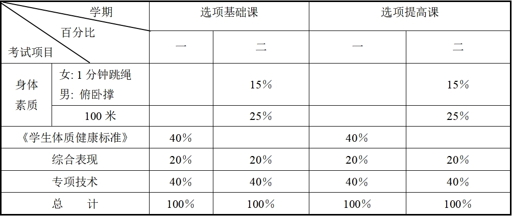 2.各学期考试项目分配及占体育课总成绩百分比(见附表1)。