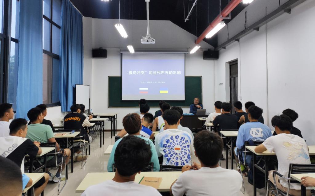 倪书记从俄罗斯、乌克兰的历史渊源、地缘政治背景、北约扩张、2014年乌克兰颜色革命等方面分析了俄乌冲突的爆发原因。随后,他详细描述了俄罗斯的诉求、俄乌当前的战争形势,以及由此引发美国对俄罗斯的经济制裁,引导师生全面了解俄乌冲突对当代世界,尤其是对中国产生的影响;表示当代青年大学生要全面了解俄乌冲突背后的大国博弈,进一步了解俄乌冲突的历史经纬与时代警示,要学会在目前复杂的世界局势中保持正确的立场,应该认真研究国际形势的变化,在观察国际局势的过程中不断提高自身视野。
