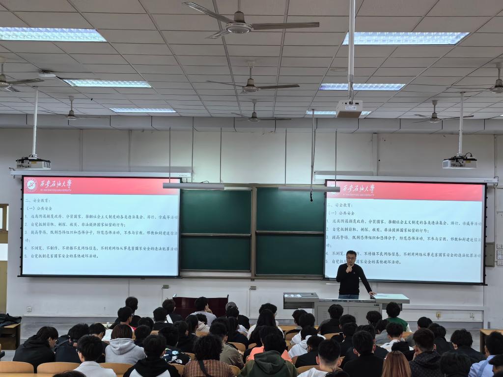 在鄠邑校区博览楼A234教室召开清明节假期学生安全教育大会。学院辅导员张泽正参加会议并提出安全工作要求,学院全体本科生参加会议。
