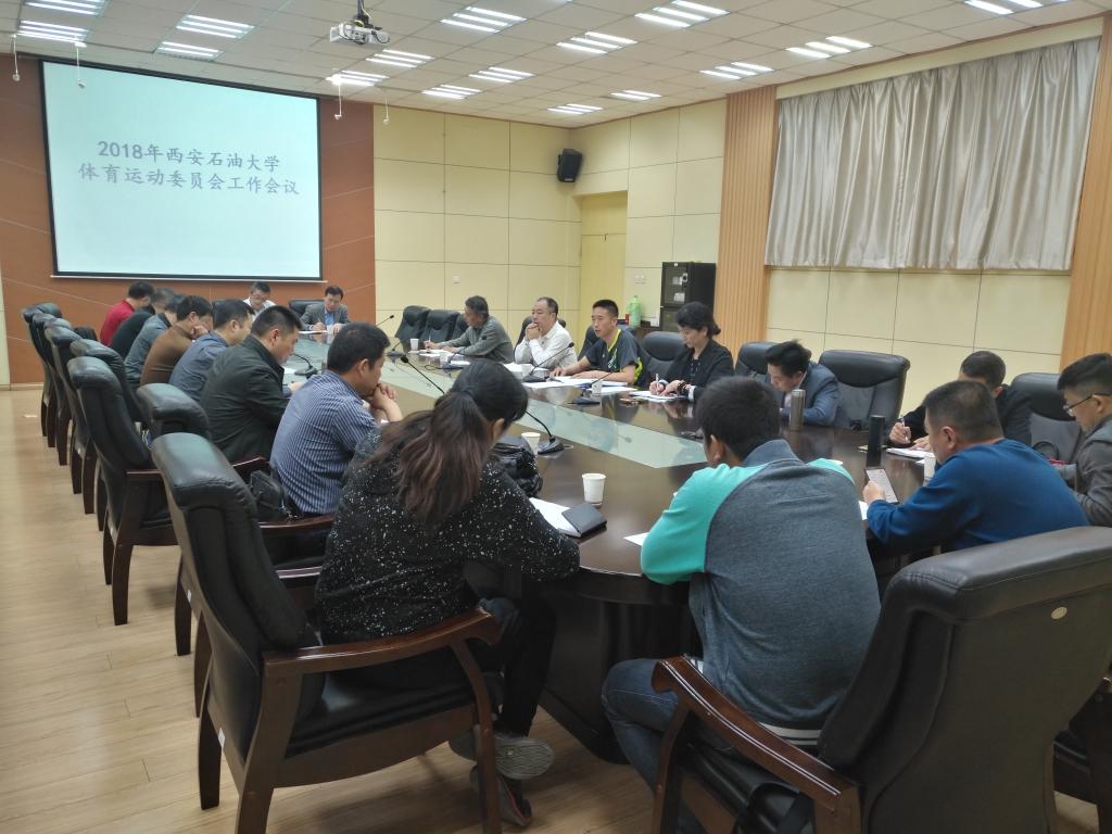 在雁塔校区第一会议室召开了2018年校体育运动委员会工作会议。来自党政办公室、宣传部、学生工作处、保卫处、工会、团委、教务处、研究生院、科技处、国际交流与合作处、人事处、计划财务处、国有资产处、新校区管委会综合办公室、信息中心、后勤服务集团、校医院主要负责人及各院(部、系)分党委(党总支)书记等参加了会议。会议由体育系党总支书记倪振文主持。