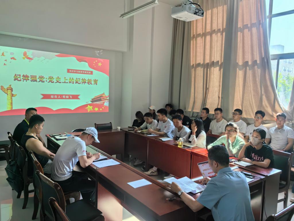 随后,苟毅飞给全体学生党员讲授了题为“纪律强党:党史上的纪律教育”党纪学习教育专题党课。党课围绕建党伊始,纪律就被视为党生存与发展的重要条件;抗日战争胜利后,纪律成为能否夺取全国政权的关键因素;新中国成立后,党的纪律建设面临更为严峻的挑战和取得的成绩;党的十八大以来,纪律教育取得显著效果;学习党的百年纪律教育史的心得体会等五个方面内容展开讲授。苟毅飞在讲授中指出,中国共产党是靠革命理想和铁的纪律组织起来的马克思主义政党,纪律严明是党的光荣传统和独特优势。我们党作为百年大党,在革命、建设、改革的各个历史时期,特别是在重要历史节点,高度重视并适时开展对全党的纪律教育,积累了丰富经验,保证了我们党不断从胜利走向胜利。做为学生党员,要以党纪学习教育为契机,加强理论学习、坚定理想信念、增强宗旨意识、严格遵守法律法规,守住纪律“底线”、不越“红线”,以昂扬的姿态为学院高质量发展贡献力量。