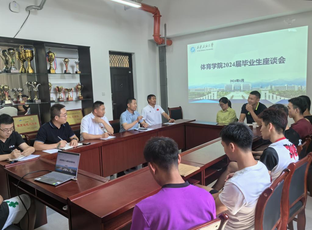 在鄠邑校区东操场208会议室举办2024届本科毕业生座谈会。学院党总支书记苟毅飞、院长李寿邦、社会体育指导与管理专业教研室主任胥山、学生工作办公室主任焦龙、辅导员张泽正及2024届全体毕业生参加座谈会。会议由学生工作办公室主任焦龙主持。