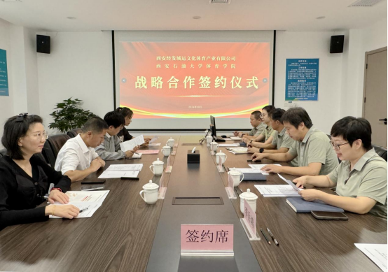 党总支书记苟毅飞一行赴西安经发城运文化体育产业有限公司走访交流,并举行合作框架协议和校外实习实践基地共建协议签约仪式。西安经发城运文化体育产业有限公司党支部书记、副总经理吴飞鹏,副总经理李婵娟及各部门经理;百合会