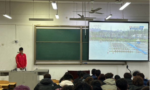 报告会上,苟毅飞首先介绍了举办本次报告会的目的,一是让广大学生了解赛艇运动知识,熟悉赛艇运动文化,并由此爱上赛艇运动;二是通过选拔的方式,组建学校赛艇运动队,并通过专业训练,能在各类赛艇比赛中获得佳绩,为学校争得荣誉。