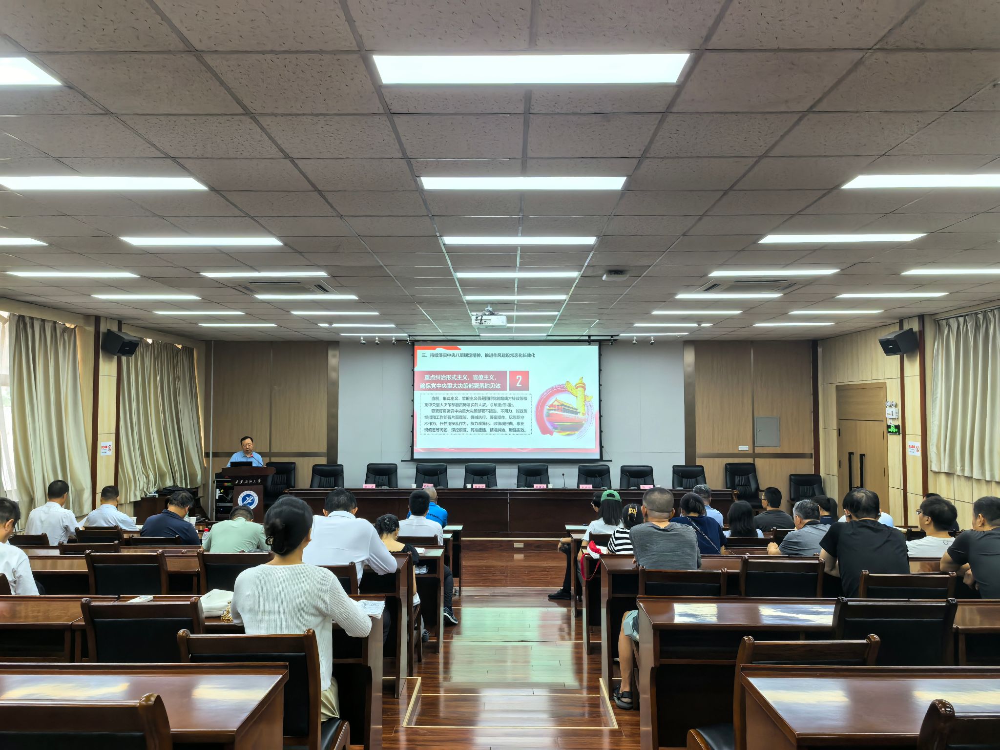 讲授中,种宇宏首先带领全体党员回顾了中央八项规定的发展历程,重温了中央八项规定及《中央列出违反八项规定清单80条》主要内容。进而从持续纠治享乐主义、奢靡之风,坚决防反弹回潮、防隐形变异、防疲劳厌战;重点纠治形式主义、官僚主义,确保党中央重大决策部署落地见效;坚持纠“四风”树新风并举,抓出自觉、形成习惯等三个方面,讲述了如何持续落实中央八项规定精神,推进作风建设常态化长效化。最后,从突出“转”字,强化作风锻造;突出“严”字,强化纪律养成;突出“防”字,强化执纪监督等三个方面,讲述了如何聚焦全面从严治党,铸强校园风清气正廉洁生态。本次专题党课讲授内容丰富,重点突出,深入解读了中央八项规定的核心要义与实践要求,并结合新时代党风廉政建设新形势,引导党员干部筑牢思想防线,将规定精神内化于心、外化于行,切实以优良作风推动工作高质量发展。