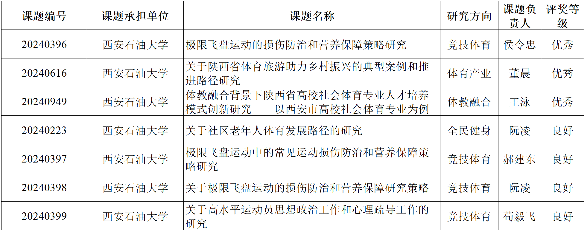喜获丰收。经评审,学院共有7项课题通过结题验收,其中3项获评“优秀”、4项获评“良好”。同时,学院获批陕西省体育局2025年常规课题17项。