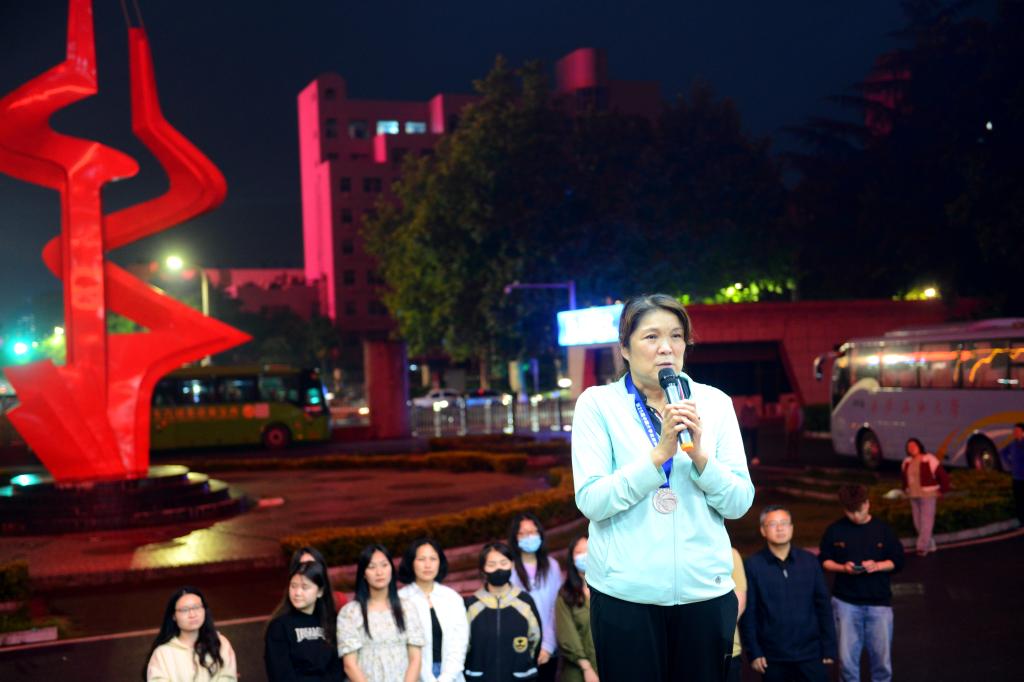 主教练秦香代表球队教练组发言。她表示,对学校组织的欢迎仪式感到无比荣耀,对多年来给予篮球队大力支持的各级领导和部门表示感谢。她回忆起多年执教之路,感慨万千,泣不成声,同时希望队员们再接再厉,更加进步。随后秦香为李天太、张木、陈军斌三位校领导赠送本届比赛季军奖牌。