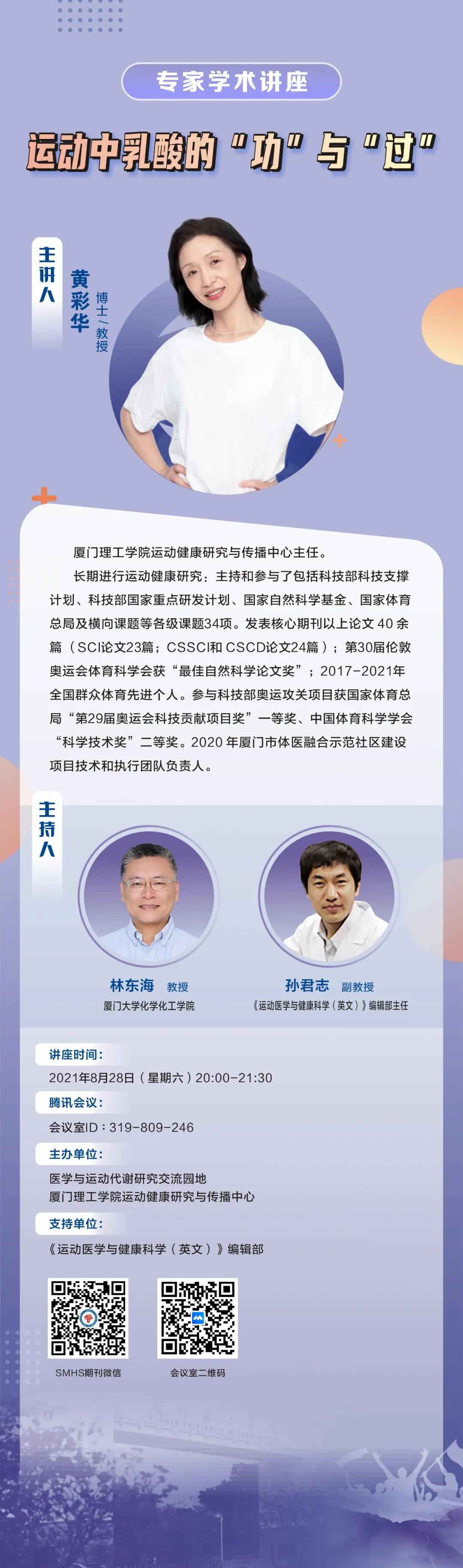黄彩华,博士,教授,厦门理工学院运动健康研究与传播中心主任。长期进行运动健康研究:主持和参与了包括科技部科技支撑计划、科技部国家重点研发计划、国家自然科学基金、国家体育总局及横向课题等各级课题34项。发表核心期刊以上论文40余篇 (SCI论文23篇;CSSCI和 CSCD论文24篇);第30届伦敦奥运会体育科学会获“最佳自然科学论文奖”;2017-2021年全国群众体育先进个人。参与科技部奥运攻关项目获国家体育总局“第29届奥运会科技贡献项目奖”一等奖、中国体育科学学会“科学技术奖”二等奖。2020年厦门市体医融合示范社区建设项目技术和执行团队负责人。
