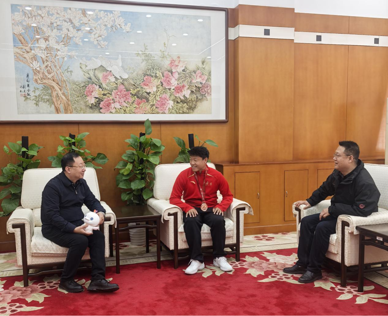 2025年11月21日,在西阶会议中心,副校长种宇宏亲切慰问了在中华人民共和国第十五届运动会群众组网球单打比赛中斩获季军的百合会